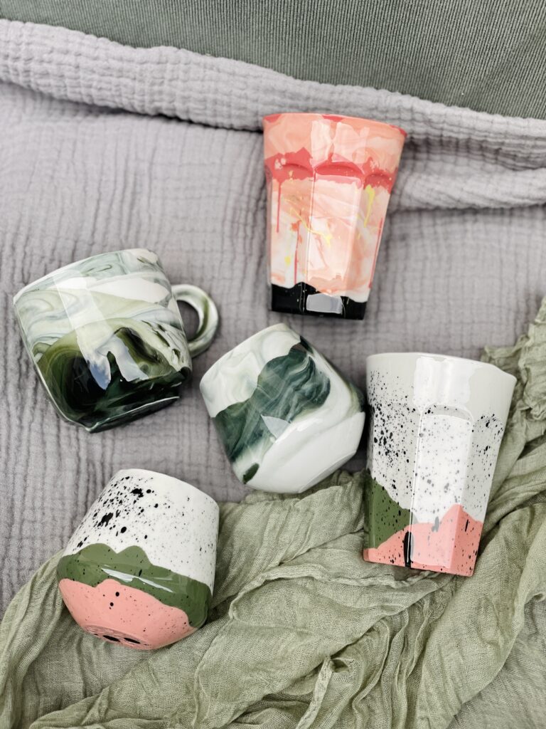 4 óra alatt mindenki kiönt magának 4 db porcelán bögrét, amire te tudod kiválasztani, hogy milyen formájú és állású fület szeretnél ragasztani. A bögréket márványos hatással öntjük ki.